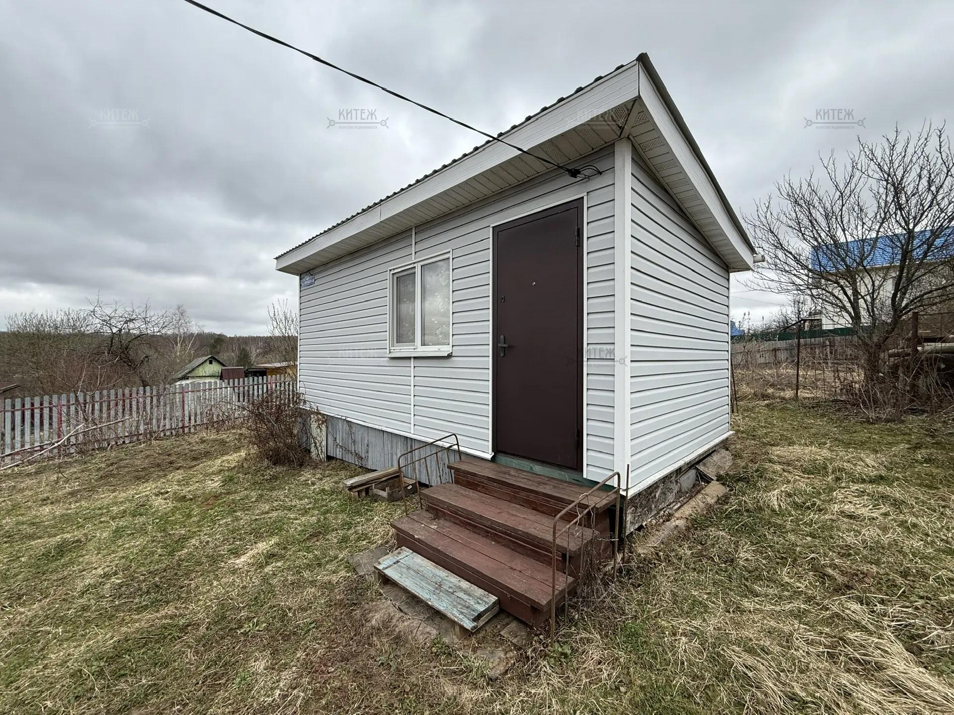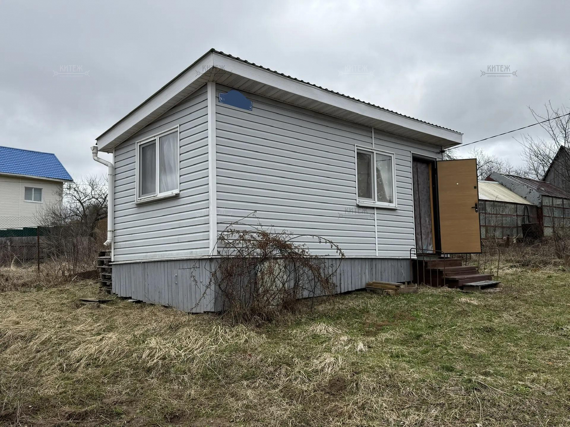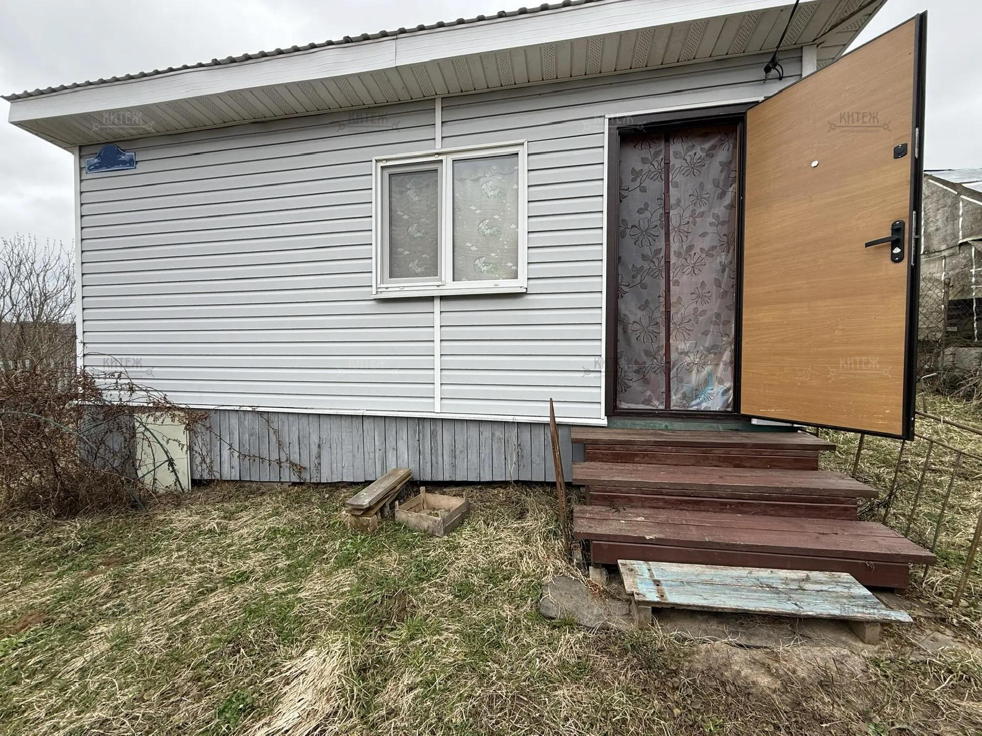 На участке расположен небольшой деревянный дачный домик площадью 22, 7 квадратных метра. Дом разделен на две комнаты - кухню с небольшим гарнитуром и комнату для отдыха. Окна ПВХ. Свет заведен в дом. Дом 2018 года постройки.