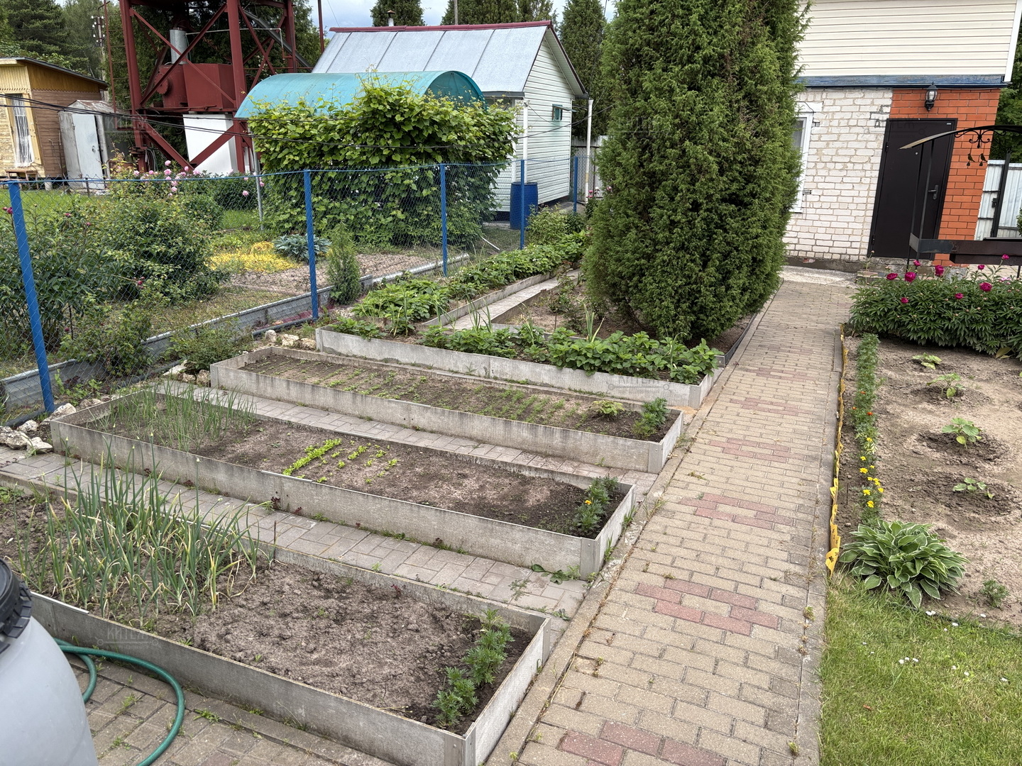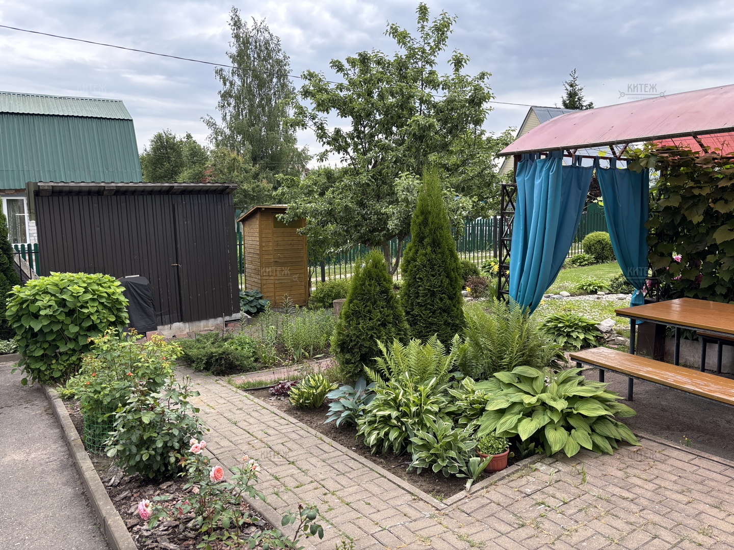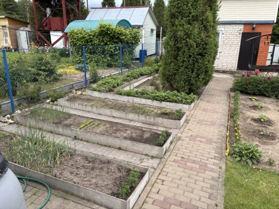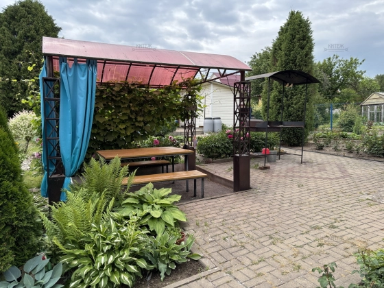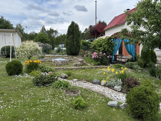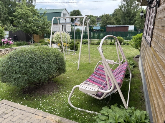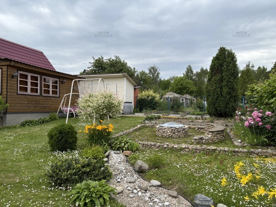 На участке ландшафтный дизайн, зелёный газон, посадки, облагороженный огород, дровник, беседка, мангальная зона, качели, костровая зона. Территория выложена тротуарной плиткой.