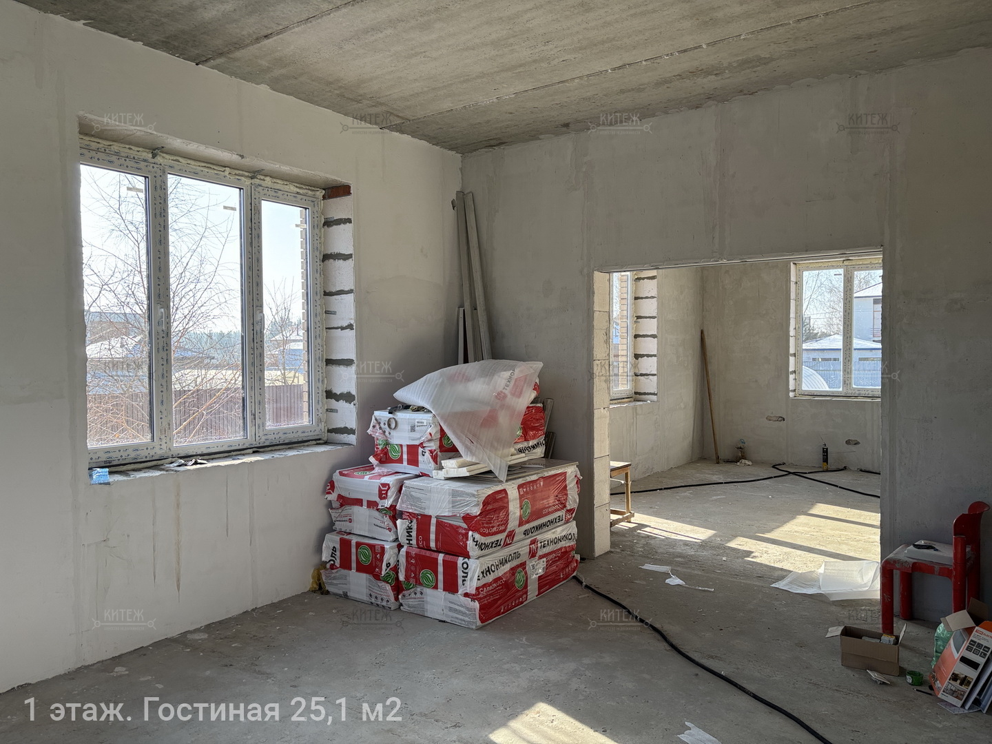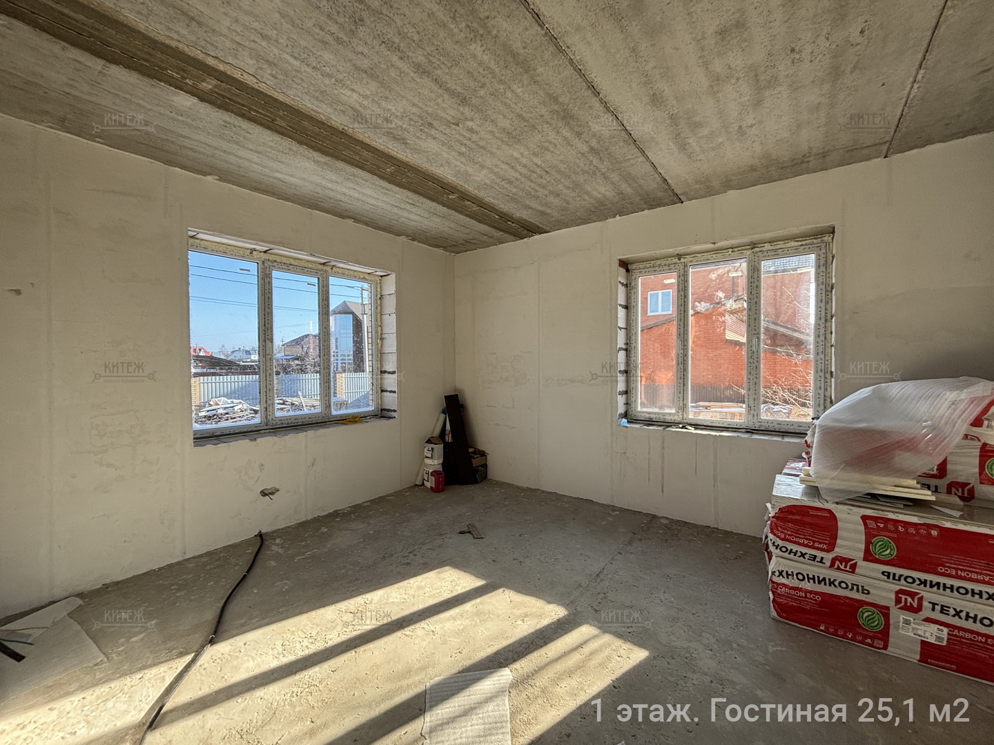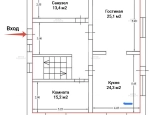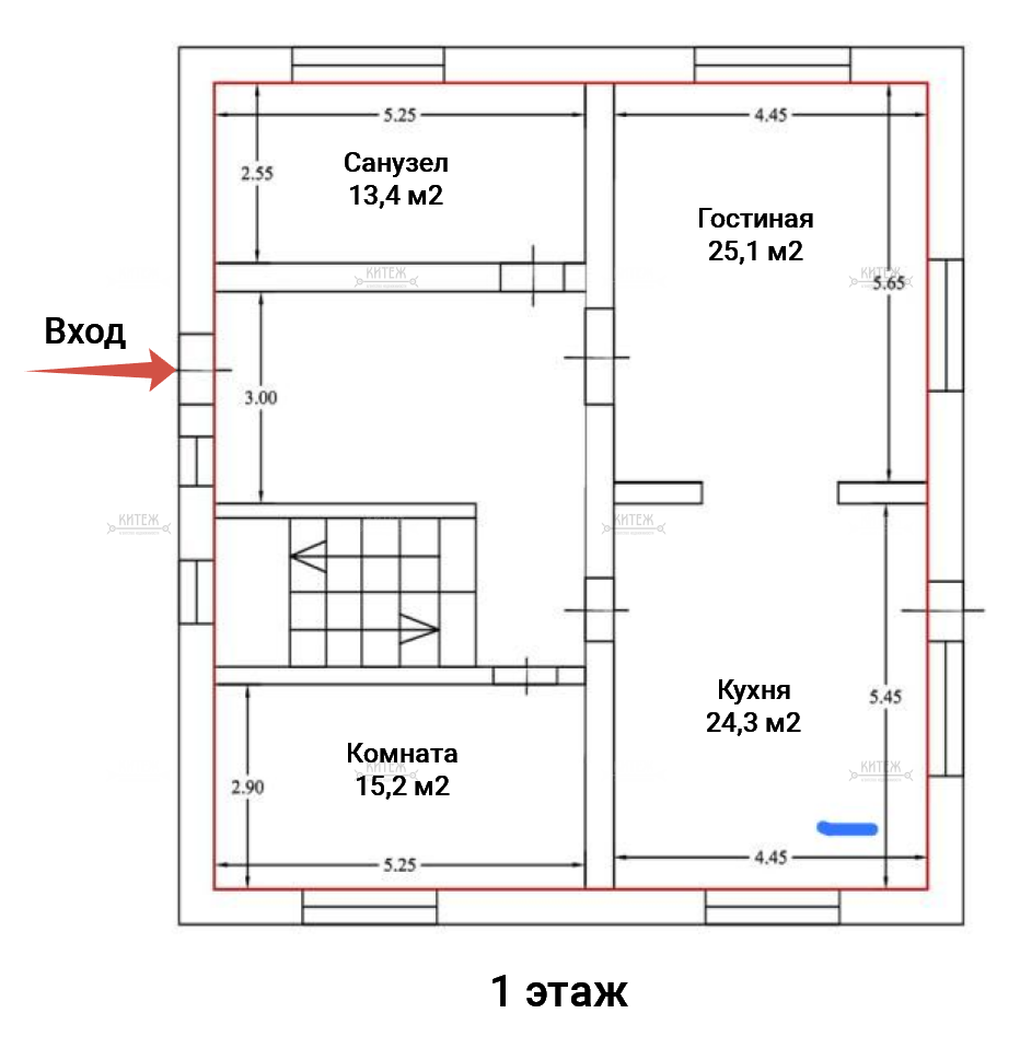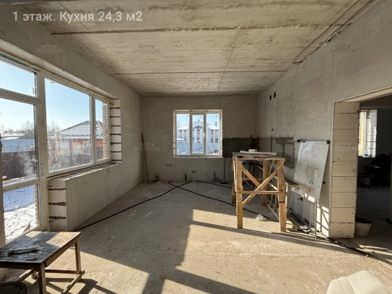 1 этаж: вместительная прихожая с выделенным местом под шкаф-купе, гостиная 25,1 кв.м., кухня 24,3 кв.м. с выходом на террасу, комната 15,2 кв.м., санузел с окном 13,4 кв.м.