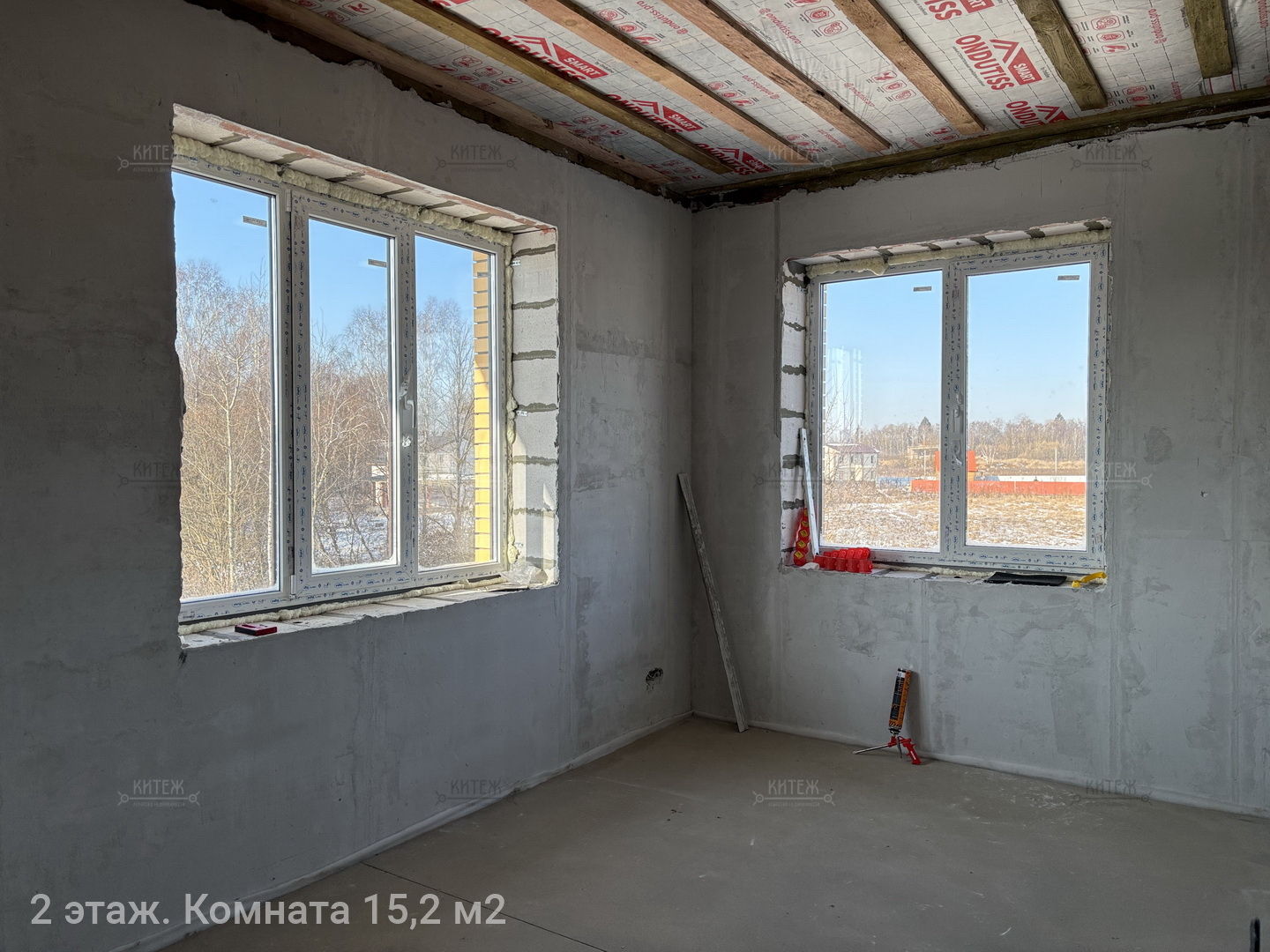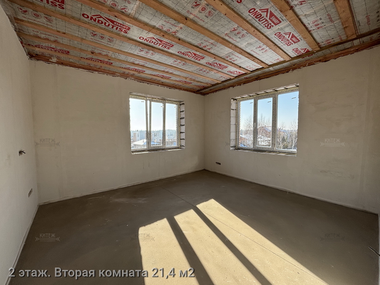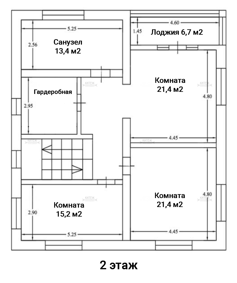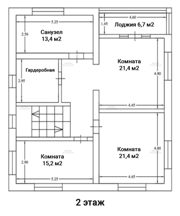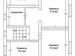 2 этаж: комната 21,4 кв.м. с лоджией 6,7 кв.м., ещё одна комната 21,4 кв.м., комната 15,2 кв.м., санузел с окном 13,4 кв.м., гардеробная с окном 9 кв.м.