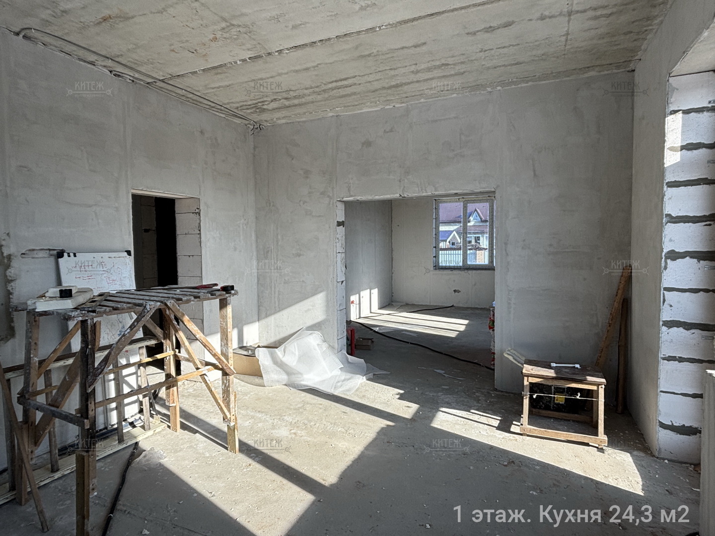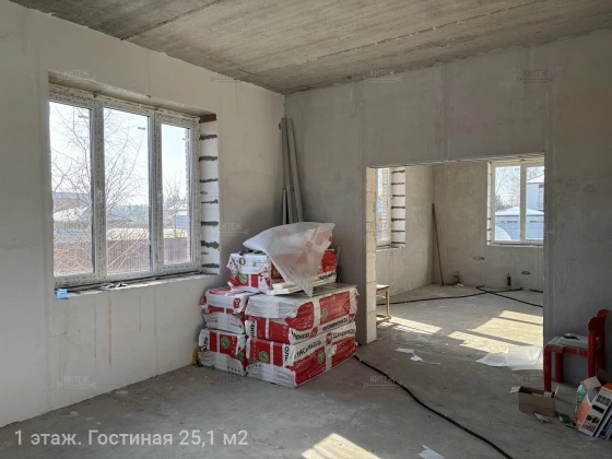 Отделка. Черновые работы уже выполнены. На полу подвального и 2 этажа сделана стяжка. На 1 этаже запланирован тёплый пол. Все стены оштукатурены по маякам. Сделана электроразводка под выключатели, розетки, приборы освещения.