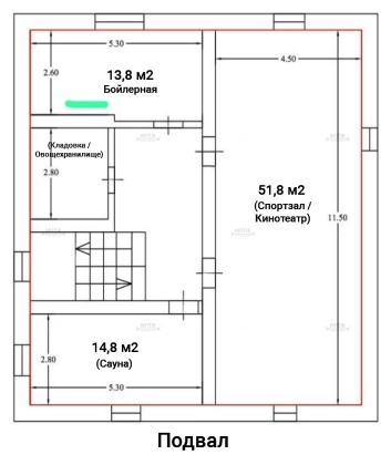 Подвальный этаж: комната 51,8 кв.м., которую можно оборудовать, например, под спортзал или кинотеатр; комната 14,8 кв.м., которую можно оборудовать под сауну; бойлерная 13,8 кв.м.; вместительная кладовка (овощехранилище).