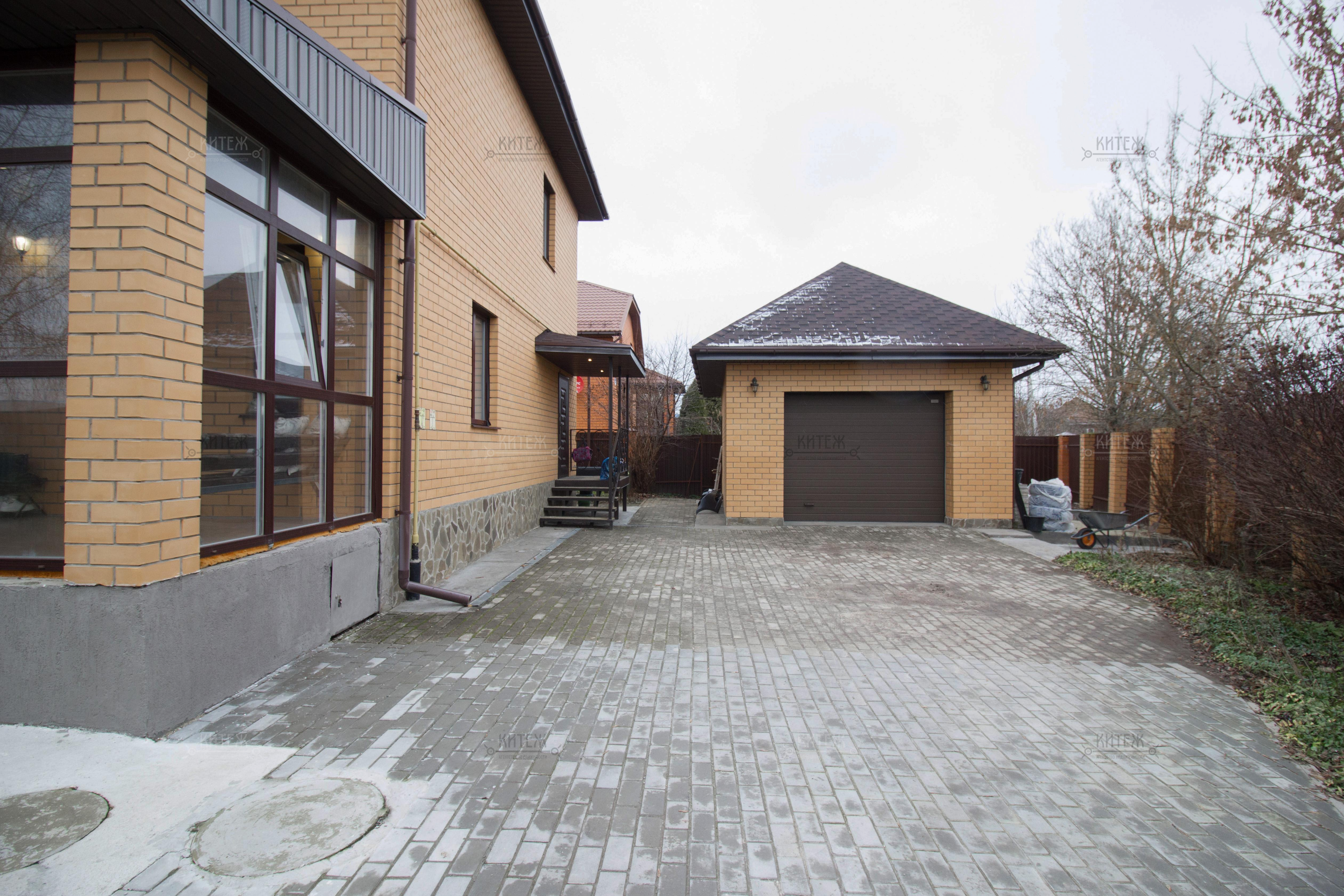 Парковка: на территории встанут две машины, в гараже одно место и за территорией на выложенной плиткой площадке встают ещё 3 машины. Парковочные места выложены плиткой.