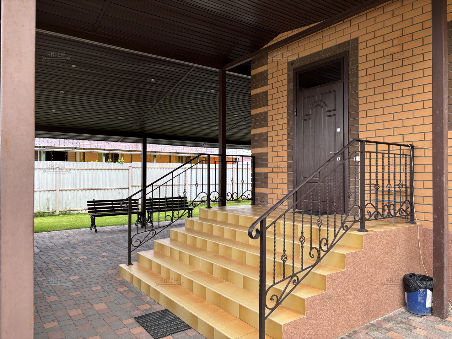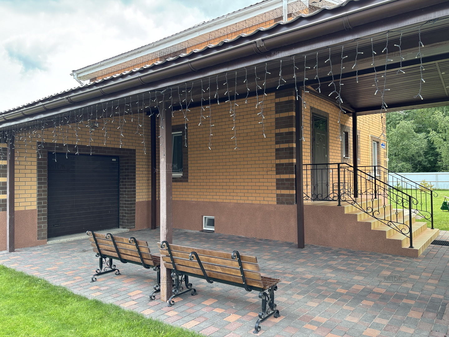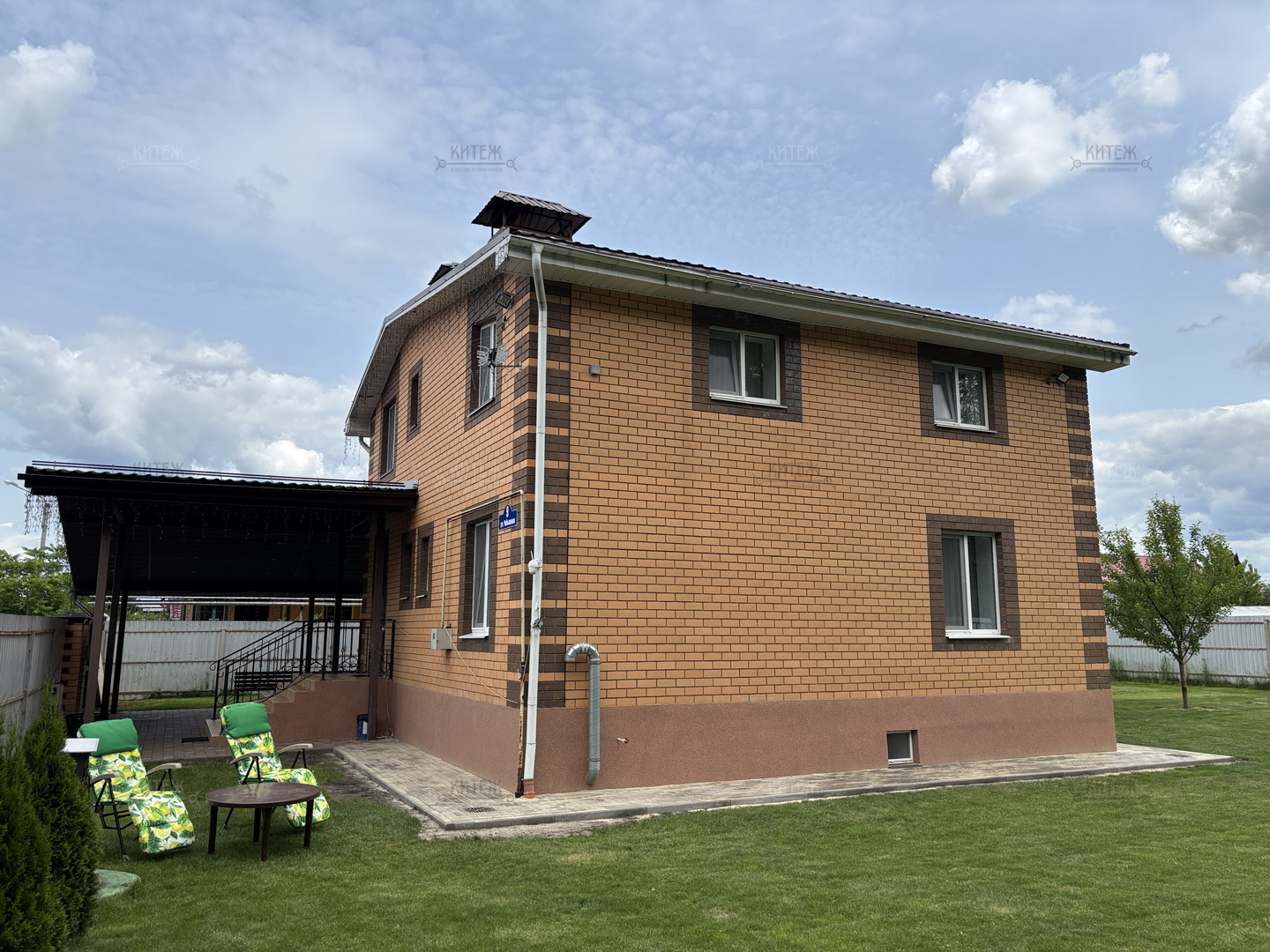 Участок 13,8 соток со всех сторон огорожен забором, при въезде распашные ворота с электроприводом. Перед входом в дом и перед гаражом территория выложена плиткой, сделан капитальный навес с точечным освещением. В остальном на площади участка ровный и мягкий ковёр зелёного газона. На участке ели, туи, парник, грядки, детский спортивный уголок, летний душ, мангальная зона.