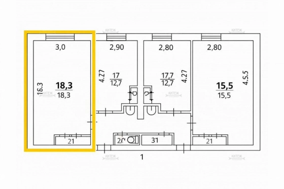 Проcторная комнатa 18,3 м² в блокe на 4 комнаты.
