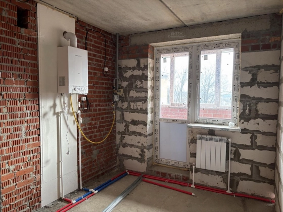 В квартире выполняется гидроизоляция полов в санузле, ввод труб водоснабжения и канализации, разводка отопления с установкой радиаторов, устанавливается настенный двухконтурный газовый котёл, все счётчики, двухкамерные стеклопакеты, остекление лоджии. Высота потолков 2,7 м.