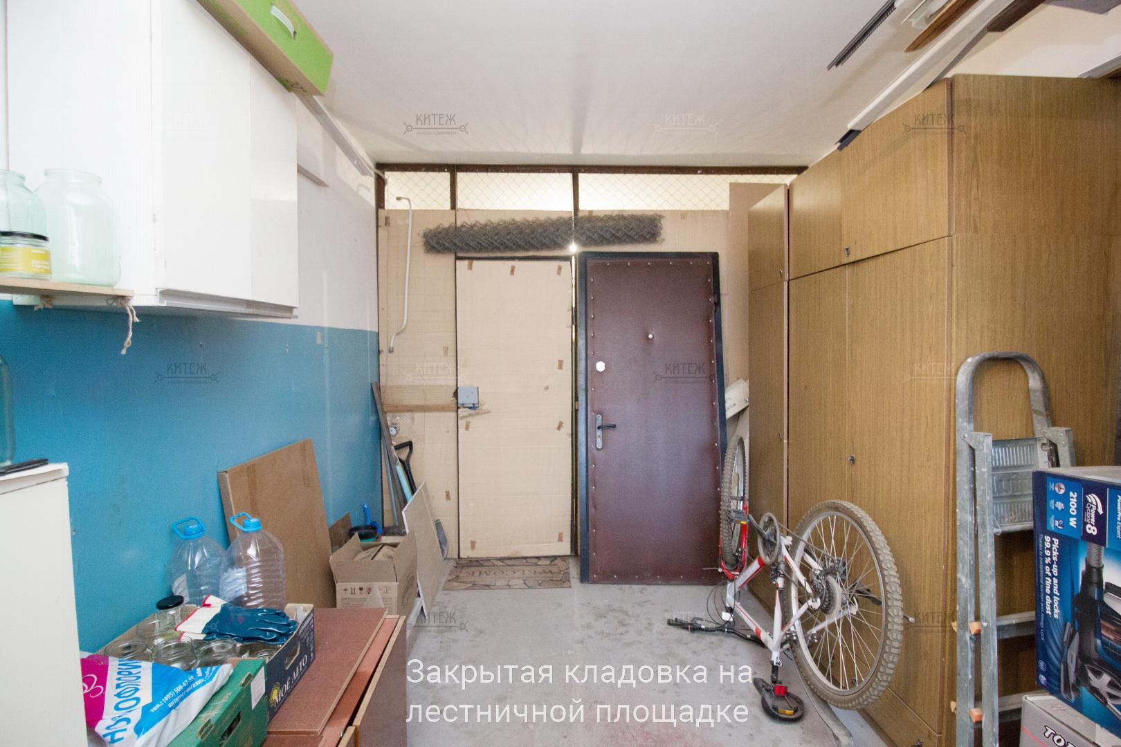 На лестничной площадке, прямо перед квартирой огорожена очень вместительная закрытая кладовка, где свободно можно разместить автомобильную резину, велосипеды, санки, несезонные вещи и т.п.
