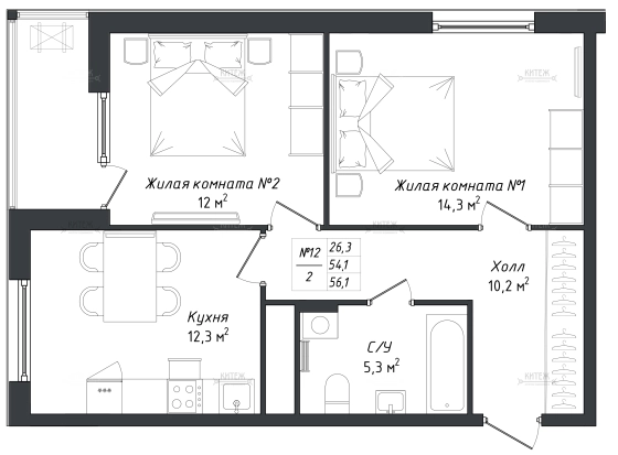 В продаже 2-комн. квартира 56,1 кв.м. с изолированными комнатами 14,3 + 12 кв.м. и кухней 12,3 кв.м. Из комнаты 12 кв.м. выходит лоджия. Совмещённый с/у. Вместительная прихожая.