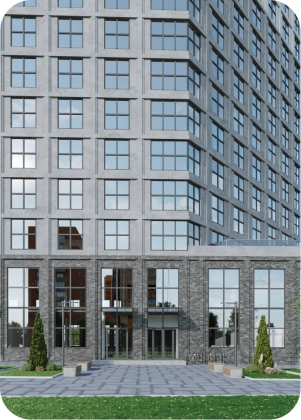Монолитный дом переменной этажности (12-18 этажей) с двумя уровнями подземной парковки и 2 надземными уровнями коммерческих помещений. На 1 этаже торговая галерея, на 2 этаже деловая офисная часть.