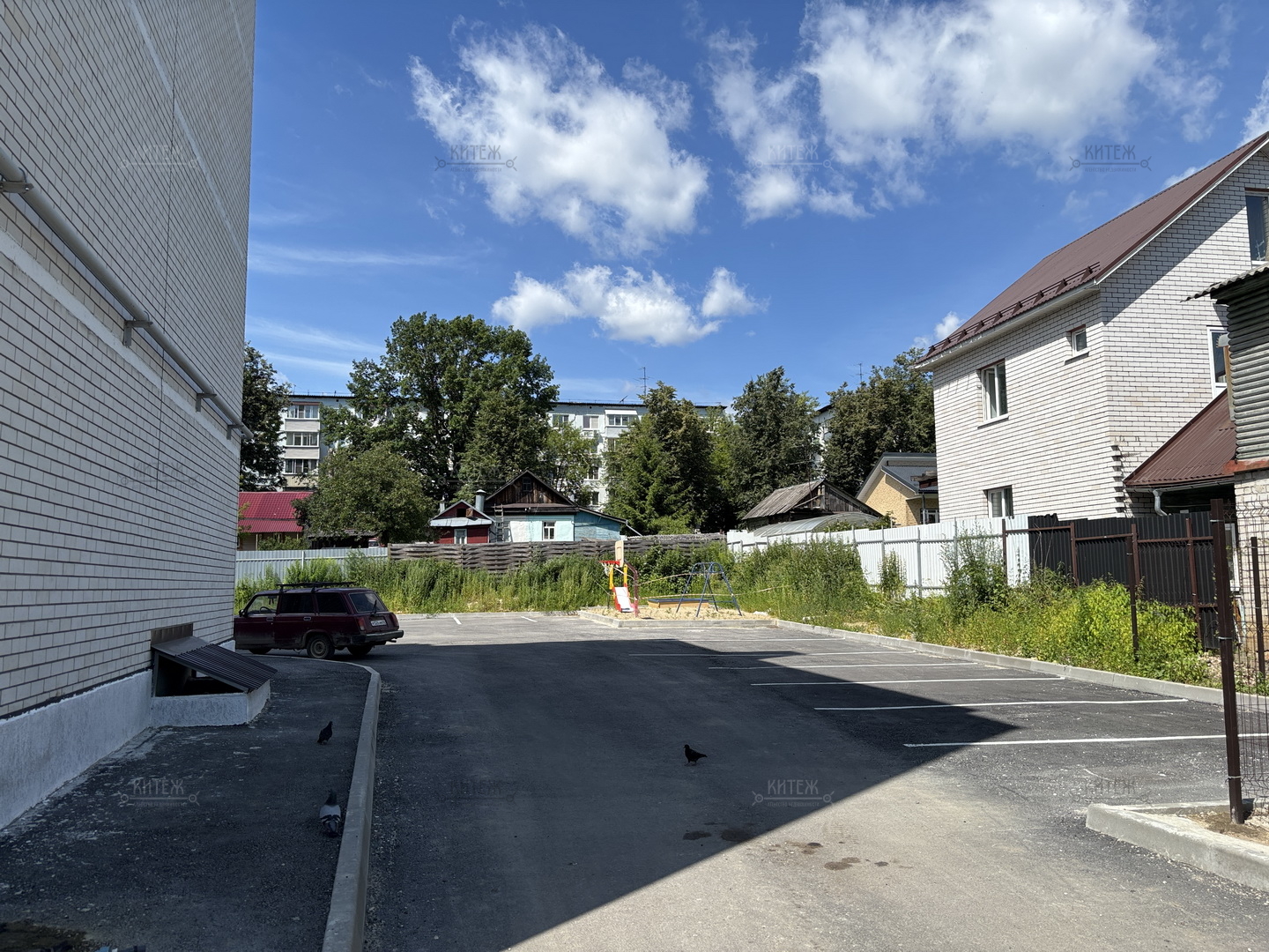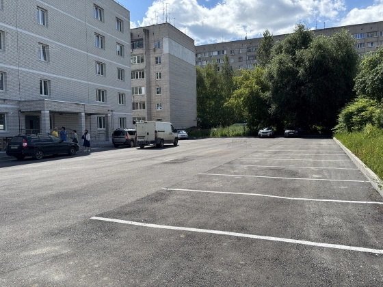 Большой огороженный двор с количеством машиномест, превышающим количество квартир.