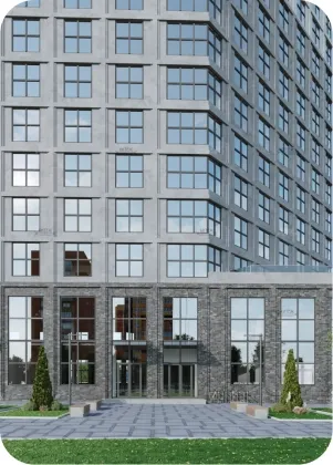 Монолитный дом переменной этажности (12-18 этажей) с двумя уровнями подземной парковки и 2 надземными уровнями коммерческих помещений. На 1 этаже торговая галерея, на 2 этаже деловая офисная часть.